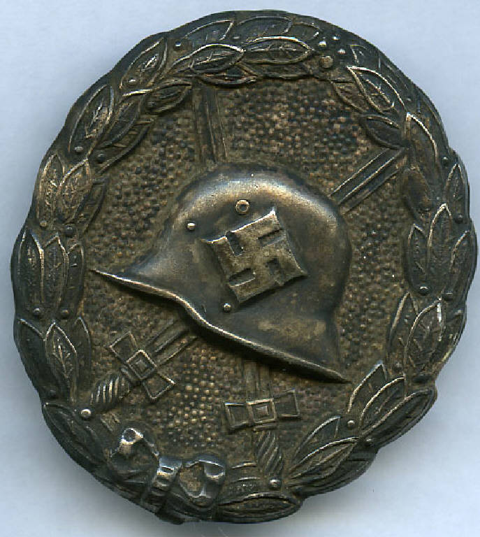 Distintivo delle Forze Armate tedesche per feriti della Seconda Guerra Mondiale. elmetto tedesco con svastica, spade e corona d'alloro