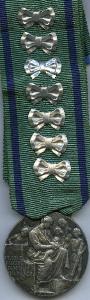 medaglia; nastro verde listato di due bande di colore turchino; sette fregi a forma di fiocco