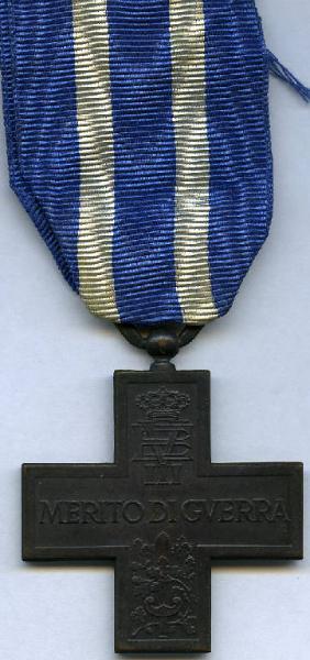 Croce al Merito di Guerra (Medagliere di Gino Capelli). "Merito di guerra" tra monogramma di Vittorio Emanuele III e gladio romano con serto d'alloro; stella raggiata a cinque punte