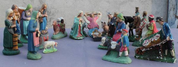 - NOTIZIE STORICO CRITICHE Presepio di piccole dimensioni realizzato a fine Ottocento su commissione di una famiglia benestante, tramandato di padre in figlio e utilizzato ogni Natale per allestire il presepio in casa. Si tratta di una vera e propria rarità poiché fu solo a partire dagli anni venti del Novecento che le botteghe artigiane cominciarono a produrre "in serie" statue in gesso di piccole dimensioni destinate all'allestimento di presepi domestici. Lo stato di conservazione non ottimale e la presenza di statue ridipinte con vernice più lucida o di figure dallo stile differente, ne confermano l'uso provato: ogni Natale le figurine rotte venivano rimpiazzate oppure venivano ridipinte quelle ormai rovinate.