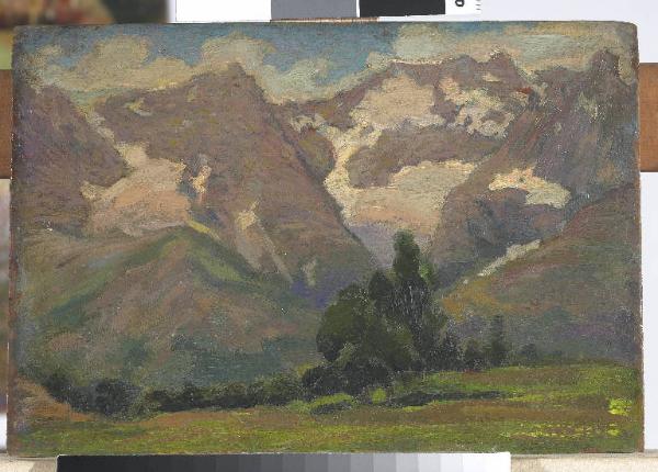 - NOTIZIE STORICO CRITICHE L'aspetto massiccio del complesso del Monte Bianco è ingentilito dall'impiego di una tavolozza calibrata sulle tonalità del rosa, esaltata dal contrasto brillante col prato in primo piano.