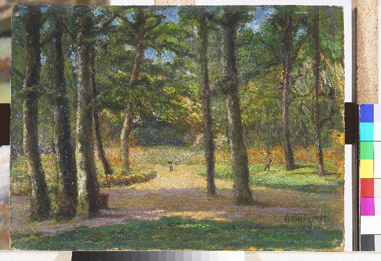 - NOTIZIE STORICO CRITICHE In omaggio alla natura Antonio Pasinetti impagina il dipinto ritraendo la maestosità di un bosco in cui le figure umane appaiono piccole e minute.