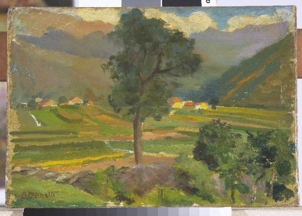 - NOTIZIE STORICO CRITICHE L'albero in primo piano esalta la profondità del paesaggio dai colori accesi caratterizzato da campi coltivati e abitazioni.