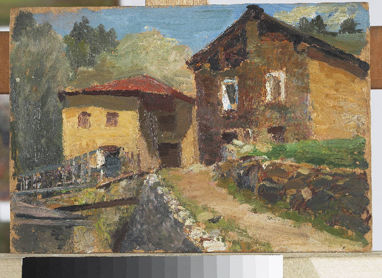 - NOTIZIE STORICO CRITICHE La scelta di una tavolozza cromatica orientata su toni bruni delinea il sapore rustico delle cascine in uno scorcio del paese montano di Vezza d'Oglio a Brescia.