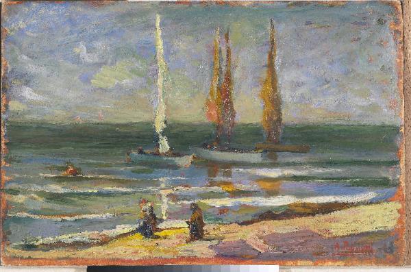 - NOTIZIE STORICO CRITICHE Le pennellate fluide donano alla composizione la percezione del movimento del mare in cui le barche fluttuano stagliandosi con le loro vele su un cielo dai toni violacei.