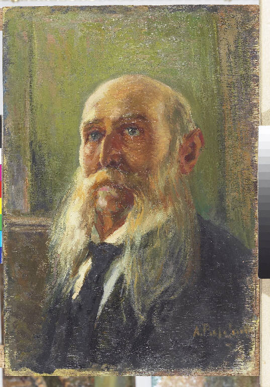 - NOTIZIE STORICO CRITICHE Antonio Pasinetti esegue numerosi studi preparatori per l'esecuzione di un ritratto come nel caso del dipinto per Giuseppe Marcora (1841-1927), avvocato e presidente della Camera dei Deputati del Regno d'Italia. La sequenza compositiva inizia con uno studio a matita conservato presso la Pinacoteca di Montichiari (Brescia) nel quale il pittore imposta la composizione della sagoma con pochi segni grafici che delineano i volumi. Di seguito, l'artista impiega il colore e realizza altri bozzetti (Inv. PPMCA00234 e Inv. PPMTA00249, Pinacoteca Pasinetti, Montichiari, Brescia) inseguendo la caratterizzazione del volto, ripreso in pose differenti, nella ricerca dell'effetto espressivo più intenso. Il ritratto ufficiale di Giuseppe Marcora è custodito presso la collezione della Cassa di Risparmio delle Provincie Lombarde a Milano. Per il confronto tra bozzetto e opera finita si veda il seguente catalogo: R. De Grada, R. Bossaglia, Antonio Pasinetti: 1863-1940, Milano 1942, pag. 79.