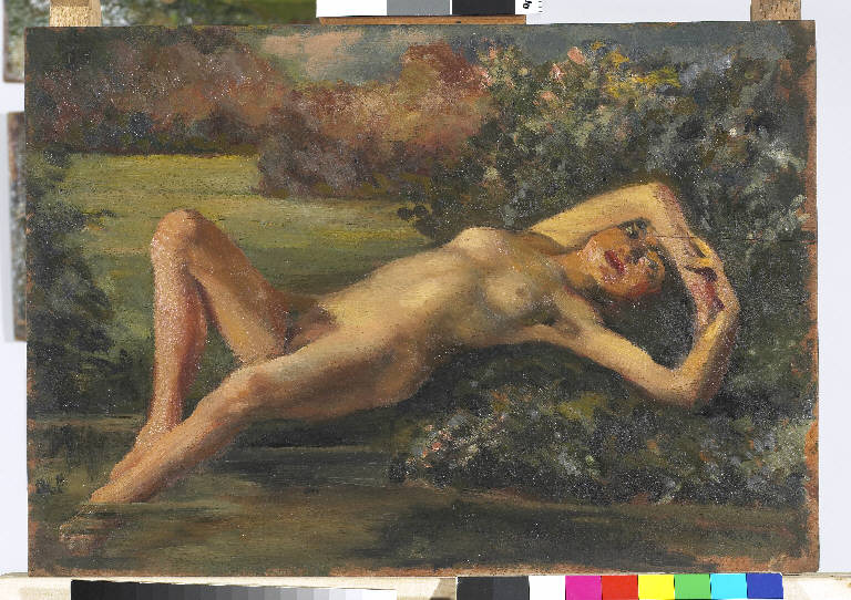 - NOTIZIE STORICO CRITICHE Lo studio di nudo è raffigurato da Antonio Pasinetti in un paesaggio naturale, distinguendosi dalla consuetudine secondo cui le modelle sono dipinte con l'atelier sullo sfondo.