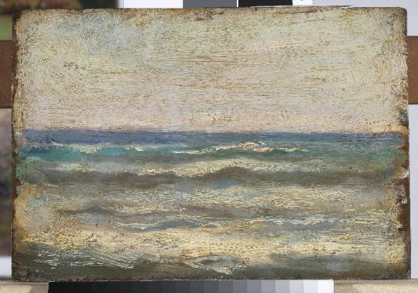 - NOTIZIE STORICO CRITICHE Il mare diviene protagonista della piccola tavola in cui è esplorato nella schiuma delle onde mosse dal vento e declinato dai toni sabbiosi del primo piano sino al celeste della linea d'orizzonte.