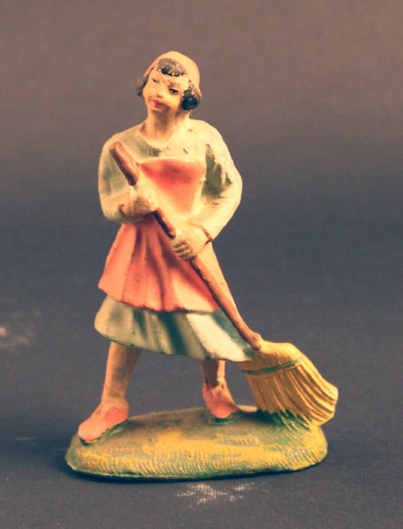 Statuetta rappresentante una giovane donna con una scopa tra le mani intenta a pulire il pavimento.