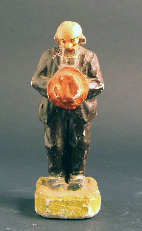 Statuetta rappresentante un uomo anziano con in mano un cappello in atteggiamento devozionale.