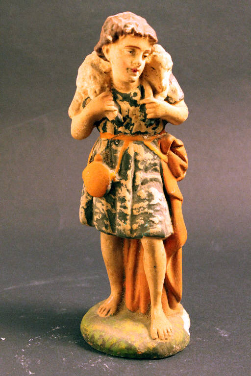 Statua da presepio rappresentante un pastore con un agnello sulle spalle.