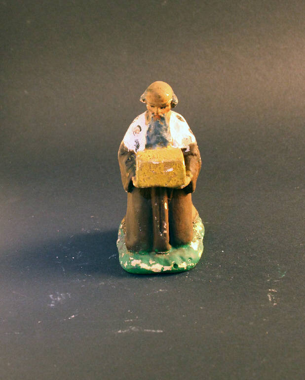 Statua da presepio rappresentante un Re Magio inginocchiato recante un dono tra le mani.