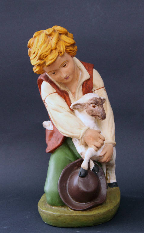 - NOTIZIE STORICO CRITICHE Il piccolo pastore accorso a rendere omaggio a Gesù trattiene la sua pecorella. La presenza dell'agnello nel presepio incarna profeticamente la drammatica sorte di Cristo: esso stesso agnello sacrificale, imolato sulla croce per il perdono dei peccati e la salvezza dell'umanità.\nLa statuetta qui descritta è del tutto simile ad altre due statue custodite presso il Museo. una di uguali dimensioni, l'altra più piccola.