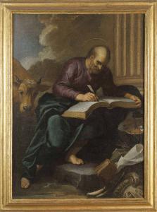 - NOTIZIE STORICO CRITICHE L'opera è parte di un ciclo di quattro tele raffiguranti gli Evangelisti proveniente dalla raccolta genovese dei marchesi Carrega, smembrata all¿inizio dell¿Ottocento. I dipinti sono ancora muniti delle importanti cornici originali e compongono un ciclo unitario la cui collocazione antica non è al momento nota. Tuttavia i soggetti e le dimensioni ragguardevoli potrebbero fare ipotizzare la loro provenienza da una chiesa o un oratorio privato.\nI santi si presentano a figura intera accompagnati dai tradizionali elementi iconografici che li caratterizzano: il bue per San Luca, l¿aquila per San Giovanni, il leone per San Marco, l¿angelo per San Matteo. La difficoltà a riferire le opere a un autore preciso è complicata dalla constatazione che almeno tre mani diverse intervennero nell¿esecuzione delle singole tele. È dunque probabile che questo ciclo, anche se concepito in modo coordinato, venne commissionato\na una bottega genovese in cui operavano alcuni artisti abituati a dividersi il lavoro.\nI quattro dipinti sono stati acquistati da Luigi Lechi nel 1994. (Notizie storico-critiche relative al progetto di aggiornamento di catalogazione del 2013-2014).