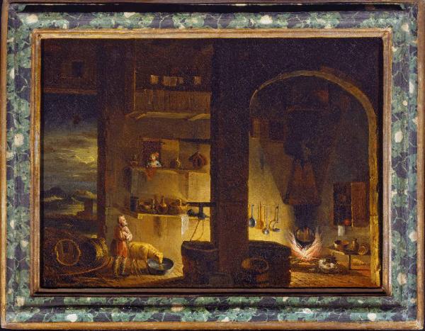 - NOTIZIE STORICO CRITICHE Il dipinto, insieme all'opera "Interno con tre donne e bambino che stringe un gatto" (Inv. MLM71, Museo Lechi di Montichiari, Brescia) proviene dalla raccolta Barbisoni, collezionisti bresciani tra i più moderni del Settecento, ammiratori di Giacomo Ceruti e Alessandro Magnasco, pittori ai quali Botti si ispira per i soggetti popolani dalle ambientazioni fantasiose. Nell'opera l¿artista si dimostra, tuttavia, molto concreto nel separare nettamente la cucina dalla cantina con il vino, a cui risulterebbe nocivo il calore del camino. La definizione degli oggetti è ordinata, precisa e attenta alla dimensione luministica, segno che l¿artista conosceva direttamente le tele fiamminghe nelle collezioni locali. Da notare anche la particolare finitura della corice originale che finge una superficie marmorea. Le due opere sono state acquistate da Luigi Lechi nel 1996. (Notizie storico-critiche relative al progetto di catalogazione del 2013-2014).