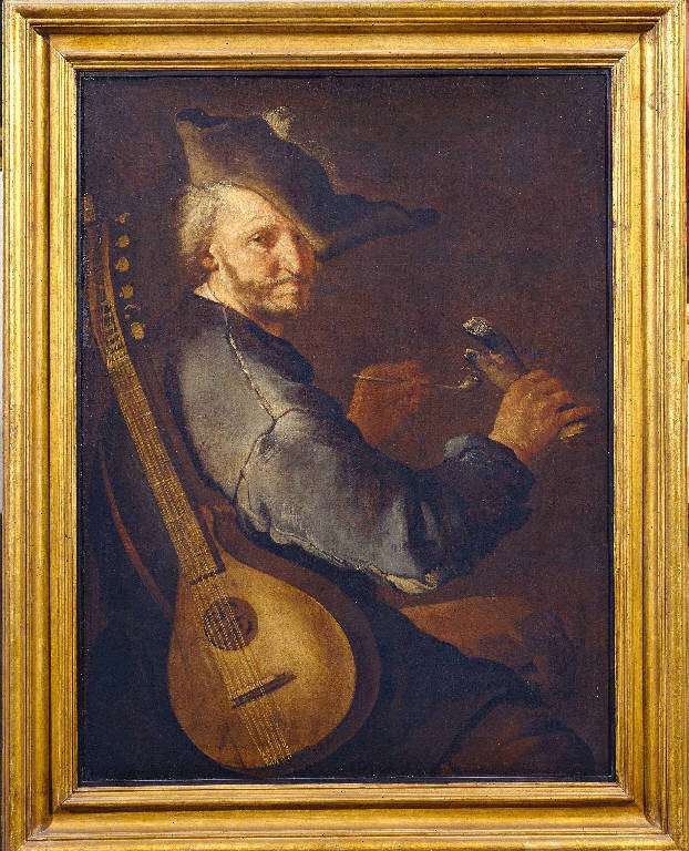 - NOTIZIE STORICO CRITICHE L¿anziano musico è raffigurato mentre si accende la pipa, usando un tizzone ardente, seduto di profilo ma colto nell¿atto di voltarsi. La giacca scucita e rattoppata\nal gomito e il tricorno piumato, evidentemente sgualcito, connotano le umili condizioni del personaggio; anche lo strumento a tracolla a dodici corde, è un chiaro riferimento alla cultura popolare dei secoli XVII e XVIII, usato in particolare dai suonatori di strada e dai cantastorie. L¿opera è stata acquistata da Luigi Lechi nel 1975. (Notizie storico-critiche relative al progetto di aggiornamento di catalogazione del 2013-2014).