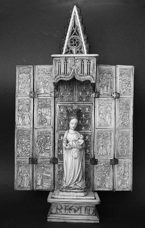 Tabernacolo a sportelli mobili composto da quattro ante, posizionate a coppie a lato del dossale fisso, snodate e legate a cerniera. Il dossale è coronato da un baldacchino pensile ad archi trilobati ribassati, decorato con bifore su fondo che finge una divisione in conci; al di sopra, cuspide decorata con rosetta centrale ed elementi gotici. Il fondo del dossale è suddiviso in otto riquadri rettangolari e decorato con gigli in rilievo su trama lineare ad incrocio. La struttura poggia su uno zoccolo rettangolare, che sostiene anche una statuetta di Madonna con Bambino.\nLa Madonna è raffigurata con una corona gigliata, indossa una lunga veste, insieme ad un lungo manto poggiato sulle spalle. Tra le braccia regge il Bambino, avvolto in un panno, che tiene in bocca un dito della mano destra mentre nella sinistra tiene un pomo.