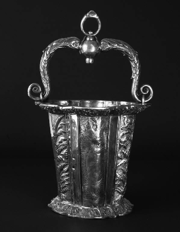 Secchiello a base polilobata, composto da sei lamine decorate, tre con scene sacre incise a bulino e tre con candelabre aggettanti. Manico raffigurante due delfini stilizzati che reggono una sfera con anello.