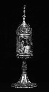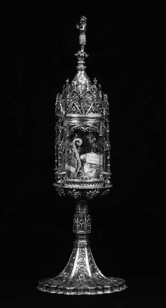 Piede a base polilobata dorata, decorata con banda traforata a cordonature verticali; da qui partono sei spicchi decorati con girali vegetali e stemmi con testine di leone che stringono agnelli tra i denti; uno degli stemmi presenta l'Annunciazione. Nodo a bifore sovrastato da struttura verticale di quattro bifore ad arcate tonde; al di sopra due ordini di frontoni traforati con cuspide che sostiene una statuetta a tutto tondo di San Giovanni Battista. La teca in vetro è stata aggiunta in un secondo momento.