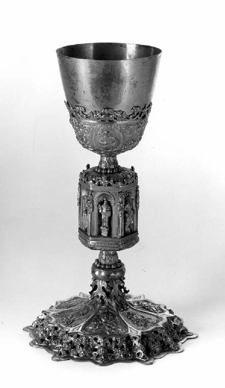 Piede polilobato con gradino decorato a traforo. Sulla base, a rilievo Vergine con Bambino, San Giovanni Battista con l'Agnello e san Francesco che riceve le stimmate, alternati a teste di cherubini. Al centro dello stelo in bronzo dorato, grosso nodo decorato con piccole figure di santi (Pietro, Paolo, Caterina, Chiara, Bonaventura e Bernardino) dentro nicchie. La coppa in argento è sorretta da un reggicoppa riccamente decorato, in cui sono inserite le immagini di San Gerardo dei Tintori, Sant'Antonio e un Cristo in pietà.
