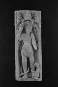 Statua in terracotta raffigurante un giovane santo guerriero in armatura con i capelli lunghi sciolti sulle spalle; il braccio destro è alzato verso l'alto, il pugno serrato a stringere una spada o una lancia, il braccio sinistro è coperto da uno scudo decorato da una croce con un fiore al centro. Ai suoi piedi, un drago che si aggrappa con le zampe anteriori alla gamba sinistra del santo, mentre avvolge con la coda il polpaccio destro. Il giovane è abbigliato con un'armatura all'antica con decorazioni stilizzate e bordure delle piastre in forma di cordoni. Tutta la figura è racchiusa entro una nicchia con decori fitomorfi e conchiglie; sulla sommità della nicchia, tre timpani con fiori.
