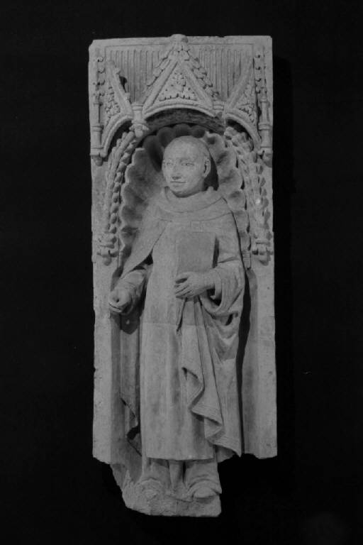 Statua in terracotta raffigurante un santo domenicano come un uomo con tonsura, in abiti da monaco, che tiene un libro nella mano sinistra, la mano destra è chiusa come a reggere un oggetto. La figura è racchiusa entro una nicchia con decori fitomorfi e conchiglie; sulla sommità della nicchia, tre timpani con foglie e fiori.