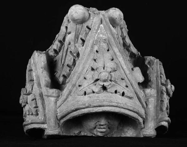 Parte di decorazione scultorea composta da piccoli timpani a base convessa, decorati con fiori e foglie, da cui spunta un viso umano. La parte superiore presenta decorazioni a fogliami e sfere.