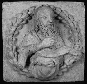 Formella quadrangolare con figura maschile barbuta a mezzo busto, abbigliata con una tunica drappeggiata, racchiusa entro una corona composta di foglie.