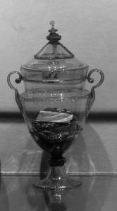 Il corpo a sezione circolare in vetro bianco traslucido poggia su un nodo, decorato a foglie e bacellature, che lo collega al piede, svasato e a base circolare. Il coperchio a profilo mistilineo è decorato con trecce sottili; è sormontato da un nodo bacellato e da una goccia. Il vaso è dotato di due anse a volute.