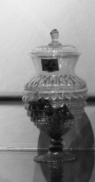 Il piede svasato a base circolare è decorato da un motivo ondulato. La coppa è sorretta da due nodi a cipolla sovrapposti; il corpo a sezione circolare è lavorato a bugne a punta di diamante, mentre nella parte superiore, dove si stringe verso il collo, è decorato a bacellature. Il coperchio schiacciato e sagomato è sormontato da una ghianda a spirale.
