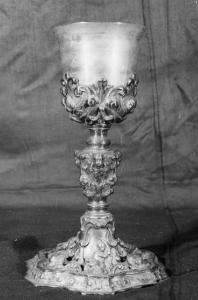 Base esalobata con gradino a decori vegetali, da cui si alza il piede con testine di cherubini a forte rilievo e volute vegetali che contengono tre immagini sacre (Madonna con Bambino, san Giovanni Battista, decollazione del Battista). Il nodo a ghianda e il reggi coppa sono decorati con lo stesso motivo a volute vegetali e testine di cherubini.