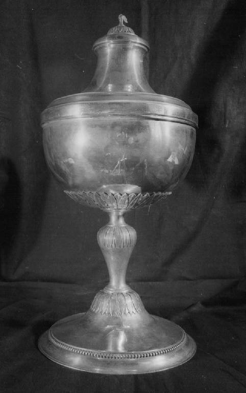 Il piede a campana con aletta è decorato con un motivo a foglie nella parte alta dove si congiunge ad uno stelo, bombato nella parte alta; un attacco più sottile sostiene la coppa dal corpo sbalzato a tutto tondo, sempre decorata alla base con un motivo a foglie. Il coperchio ad invaso rovescio presenta sulla cima una cupoletta in cui torna lo stesso motivo. Probabilmente mutila della croce terminale.