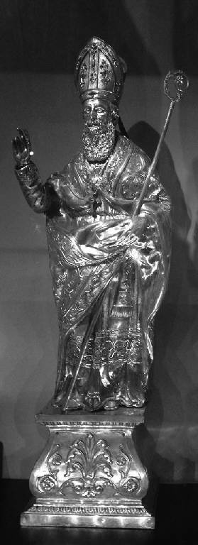 Il basamento è decorato con palmette a rilievo, fiori e volute. Il santo è rappresentato in veste solenne, con un pivialedecorato a fiorami. Il braccio destro è piegato in atto di benedire, quello sinistro regge il pastorale e il piviale, sul capo porta la mitra. Il santo è rappresentato con la barba lunga al petto, e al collo porta una croce con una piccola teca all'incrocio dei bracci.