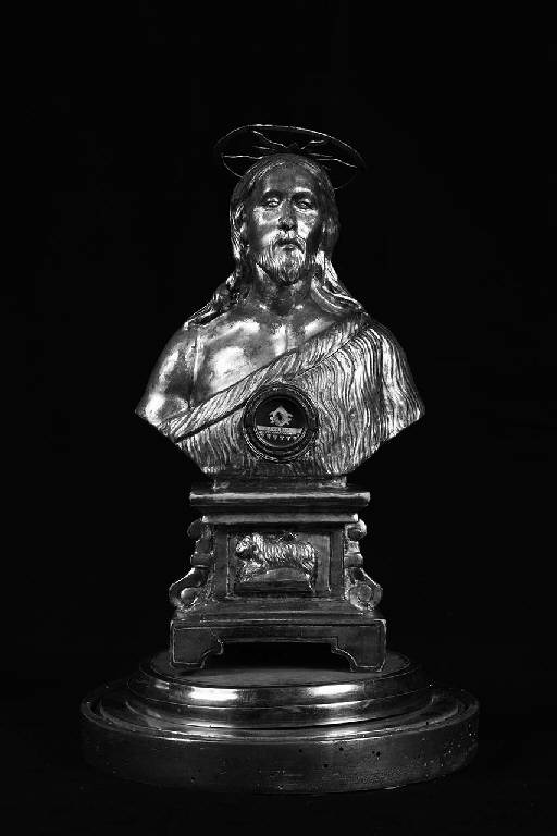 Busto reliquiario raffigurante san Giovanni Battista su base rettangolare con due volute laterali, sostenuta da quattro piedi leonini; sulla lastra frontale è raffigurato l'agnello mistico adagiato su un libro; sulla lastra posteriore è presente invece un decoro composto da due girali vegetali molto elaborati che partono da un elemento ovoidale centrale.\nIl santo è raffigurato con la pelle di cammello che copre la spalla destra e scende lasciando scoperta la spalla sinistra. Il viso è incorniciato da lunghe ciocche di capelli; all'altezza del pomo d'Adamo il collo è circondato da una fascia metallica, in parte nascosta da alcune ciocche di capelli. Sul capo è presente un'aureola dorata, mentre al centro del petto si apre una cornice circolare dorata per le reliquie del santo.