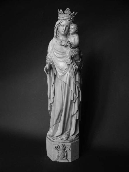 Madonna con bambino stante, disposta su un piedistallo a base esagonale che reca sul fronte lo stemma papale a rilievo. La Vergine indossa una lunga veste dallo scollo rotondo decorato e un manto che le copre il capo sotto la corona. La corona è composta da una fascia dritta a cui è sovrapposta una fascia a piccole punte, alcune delle quali sostengono dei trifogli. Il manto incornicia il viso della Vergine, lasciando intravedere la scriminatura e parte dei capelli ondulati, poi si drappeggia sia lungo la schiena che lungo il braccio destro. Con la mano e il braccio sinistro sostiene Gesù bambino, appoggiato alla sua spalla, con il corpo e il viso rivolto verso destra. Anche lui indossa una tunica lunga, dallo scollo rotondo, che lascia scoperto un piede; le braccia sono allargate e la mani sono atteggiate in atto di benedire.
