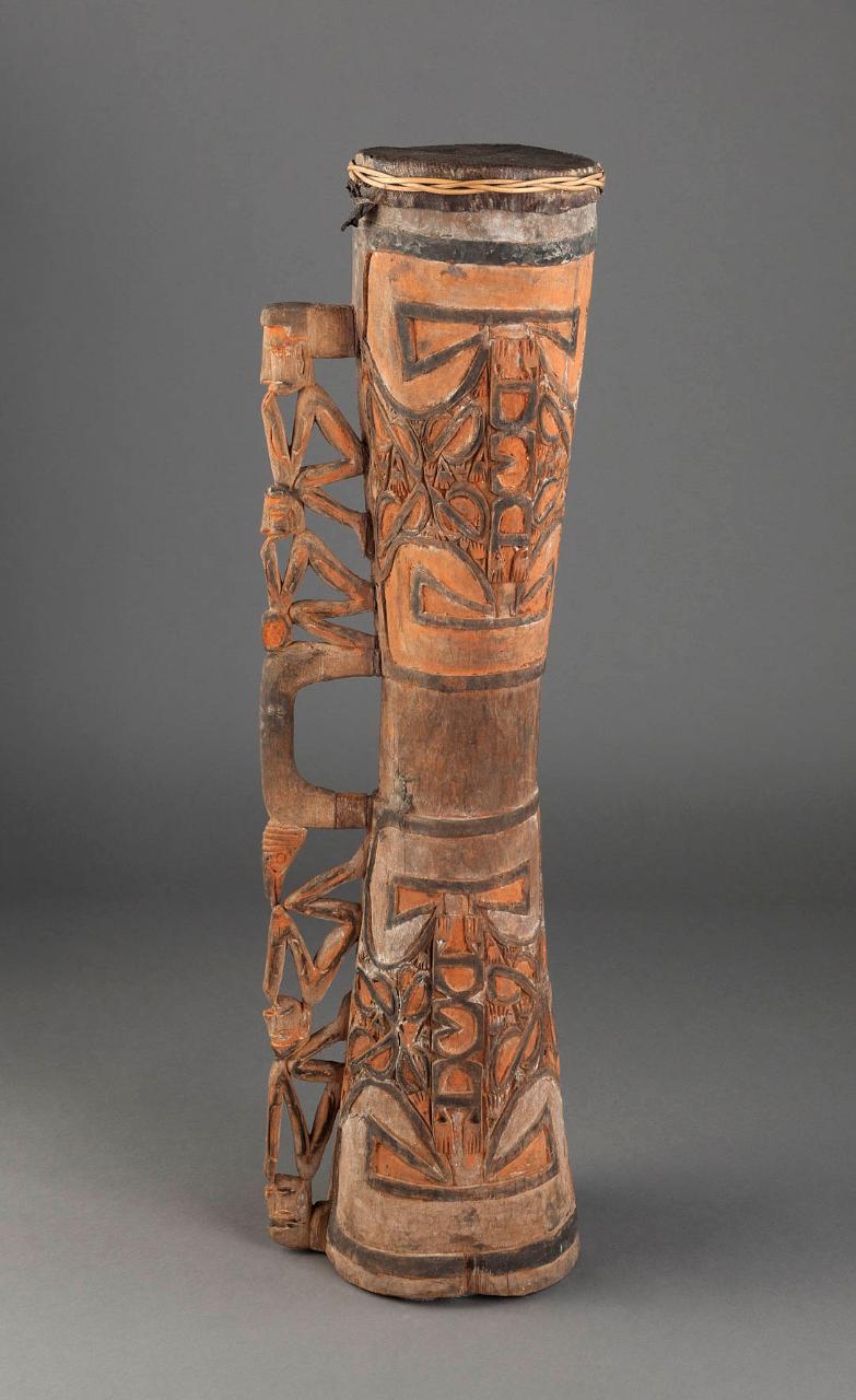 - NOTIZIE STORICO CRITICHE Opera raccolta durante i viaggi di Maurizio Leigheb fra il 1986 e il 1999.\nStrumento principale tra gli Asmat, tipicamente a forma di clessidra. Viene ricavato da un singolo blocco di legno, manico compreso. L'albero viene tagliato della lunghezza desiderata, inciso e lasciato asciugare. Successivamente il tamburo viene gradualmente svuotato e rifinito, chiuso poi con pelle di lucertola incollata con una mistura di calce e sangue, in genere appartenente al suonatore stesso.\nIl corpo può essere sia liscio, sia più o meno riccamente decorato. La grandezza dell'impugatura e la sua decorazione varia per ogni gruppo etnico. Quest'ultima comprende semplici simboli astratti, S e quadrati, combinati con figure antropomorfe, animali e motivi naturali. (Gunter e Ursula Konrad, 1981, p. 182) (The Asmat of New Guinea, 1967, p. 27)
