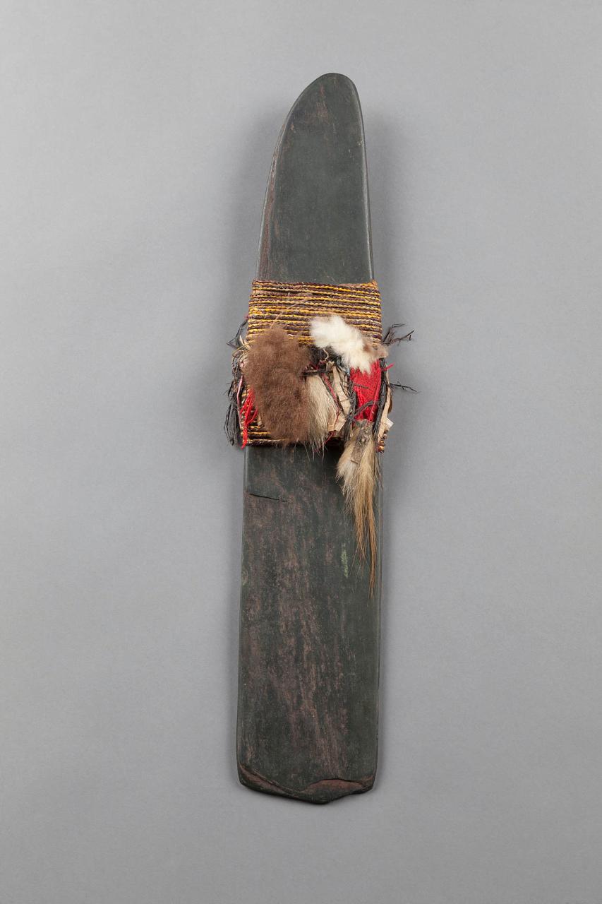 Pietra piatta levigata dalla forma allungata, con l'estremità superiore leggermente a punta. Essa è decorata con una corda di fibre vegetali legata intorno alla pietra a modo di fascia. Su di essa sono applicate piume e decori in pelo e fibra vegetale.