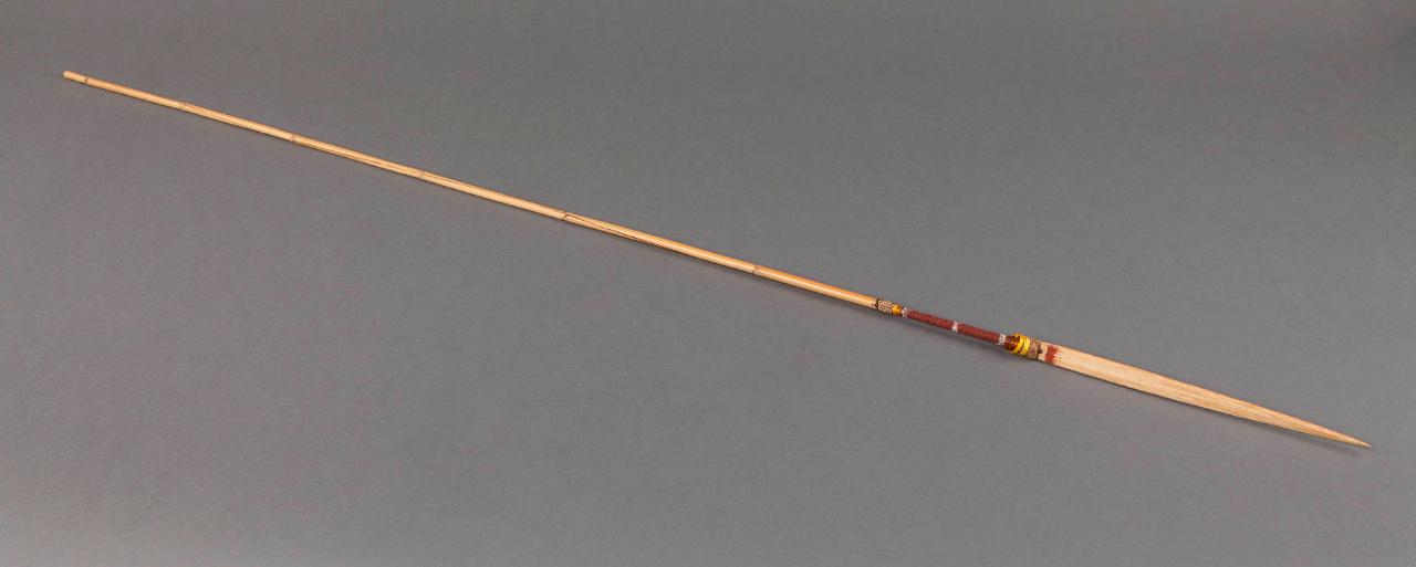 Freccia in bambù appuntito. Lungo l'asta, al termine della punta, è presente una fascia ricoperta in fibra vegetale rossa.