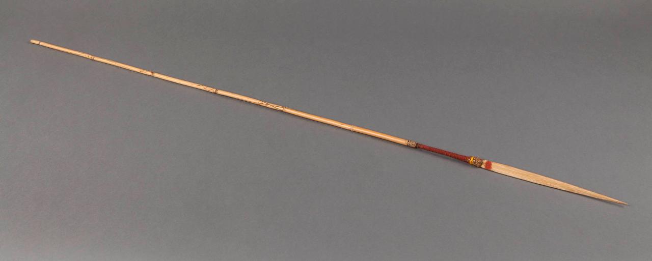 Freccia in bambù appuntito. Lungo l'asta, al termine della punta, è presente una fascia ricoperta in fibra vegetale rossa.