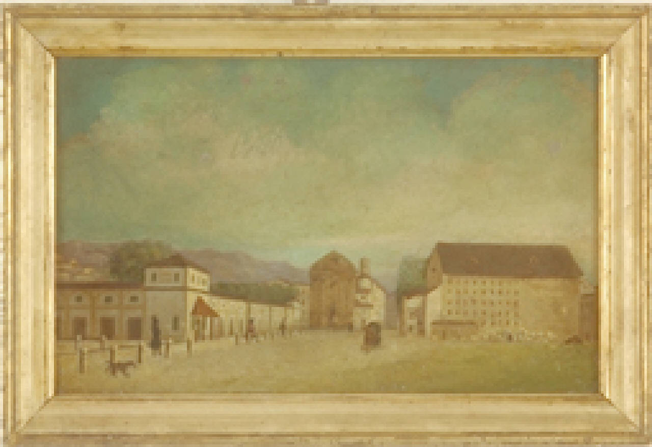 - NOTIZIE STORICO CRITICHE Nella veduta, donata da Paolo Gaffuri nel 1912, si vedono il Sentierone, chiuso sullo sfondo dalla facciata della chiesa di San Bartolomeo, il Teatro Riccardi, poi rimodernato e intitolato a Gaetano Donizetti (1897) e le facciate delle botteghe della Fiera, acquistate tra il 1906 e il 1914 dal Comune che le demolì per far posto al nuovo centro urbano progettato dall'architetto Marcello Piacentini (Roma 1881-1960).\nCatalogo Rossi: 427/B66.