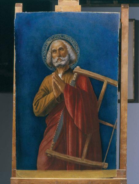- NOTIZIE STORICO CRITICHE Il dipinto proviene dalla Chiesa di S. Maria della Consolazione ad Almenno San Salvatore. Trasferito in S. Nicola e passato di proprietà ai Lurani Cernuschi, è stato da questi depositato all'Accademia Carrara con un deposito decennale rinnovabile insieme ad altre otto tavole, tutte ascrivibili ad Antonio Boselli. Ad eccezione di una "Madonna col Bambino" di origine ignota, le altre tavole appartengono a due diversi polittici, datati rispettivamente al 1503 e al 1515. Del primo complesso facevano parte il "Battesimo di Cristo" e due tavole con "Sant'Agostino" e "Sant'Antonio Abate" (una lunetta con il "Padre Nostro" risulta dispersa). Il secondo era a due ordini: in basso una statua di "S. Rocco" (sulla quale sembra fosse riportata la data 1515) e due tavole con "San Sebastiano" e "San Cristoforo", in alto la "Madonna in trono" con "Sant'Andrea" e il presente "San Giuseppe". Esistono ancora incertezze sulla reale disposizione delle tavole e sulla loro collocazione cronologica-stilistica.
