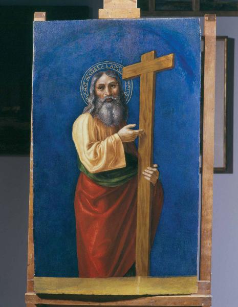 - NOTIZIE STORICO CRITICHE Il dipinto proviene dalla Chiesa di S. Maria della Consolazione ad Almenno San Salvatore. Trasferito in S. Nicola e passato di proprietà ai Lurani Cernuschi, è stato da questi depositato all'Accademia Carrara con un deposito decennale rinnovabile insieme ad altre otto tavole, tutte ascrivibili ad Antonio Boselli. Ad eccezione di una "Madonna col Bambino" di origine ignota, le altre tavole appartengono a due diversi polittici, datati rispettivamente al 1503 e al 1515. Del primo complesso facevano parte il "Battesimo di Cristo" e due tavole con "Sant'Agostino" e "Sant'Antonio Abate" (una lunetta con il "Padre Nostro" risulta dispersa). Il secondo era a due ordini: in basso una statua di "S. Rocco" (sulla quale sembra fosse riportata la data 1515) e due tavole con "San Sebastiano" e "San Cristoforo", in alto la "Madonna in trono" con il presente "Sant'Andrea" e "San Giuseppe". Esistono ancora incertezze sulla reale disposizione delle tavole e sulla loro collocazione cronologica-stilistica.