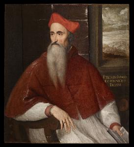 - NOTIZIE STORICO CRITICHE Il dipinto, donato al Comune di Bergamo da Marcantonio Foppa morto a Roma nel 1673, è copia antica, di scuola veneta, del celebre "Ritratto del cardinale Pietro Bembo" eseguito da Tiziano verso il 1545 e ora nella Galleria Nazionale di Capodimonte. Il riferimento al cardinale e all'autore della fonte iconografica è contenuto nell'iscrizione latina che figura sotto la finestra con paesaggio. Tiziano lo aveva già ritratto qualche anno prima nel dipinto della National Gallery di Washington poco dopo il 1539, anno della nomina a cardinale. Il dipinto si trova nella Galleria detta dei Cardinali a Palazzo Frizzoni.