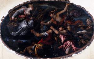 - NOTIZIE STORICO CRITICHE La grande tela ovale appartiene ad un ciclo di tre dipinti per la Sala del Consiglio del Palazzo Comunale di Bergamo; si conserva ancora il telero con "Il Podestà Francesco Benedetti che presenta Bergamo a Venezia" (Bergamo, Sala Galmozzi) mentre il terzo è andato distrutto nel 1797.