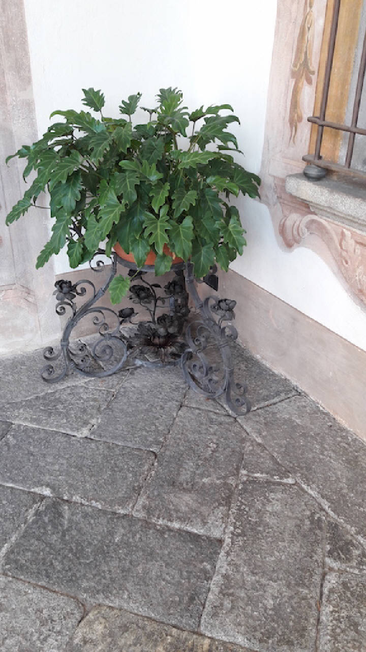 Portavaso in ferro battuto con motivi decorativi a ricciolo e fiori di diversa fattura.
