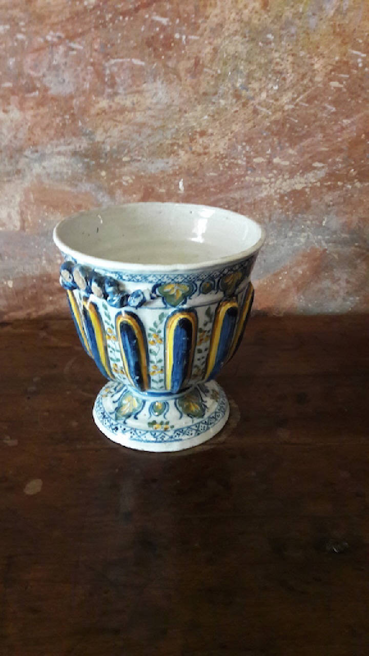 Coppia di due cachepot in terraglia dipinta policroma. Motivi decorativi floreali e geometrici, parti decorative in rilievo.
