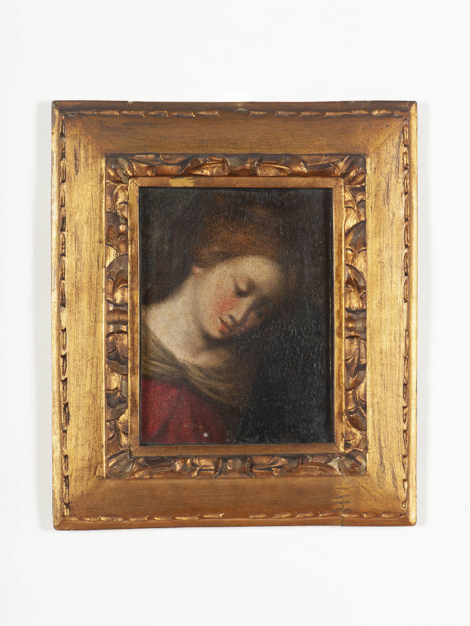 Dipinto inserito entro una cornice in legno intagliato e dorato. \nIl soggetto raffigurato occupa quasi l'intera superficie messa a disposizione. \nMorbidezza nella resa dell'incarnato del volto mediante trapassi graduali di chiaroscuro. Contrasti tra toni caldi e toni freddi.