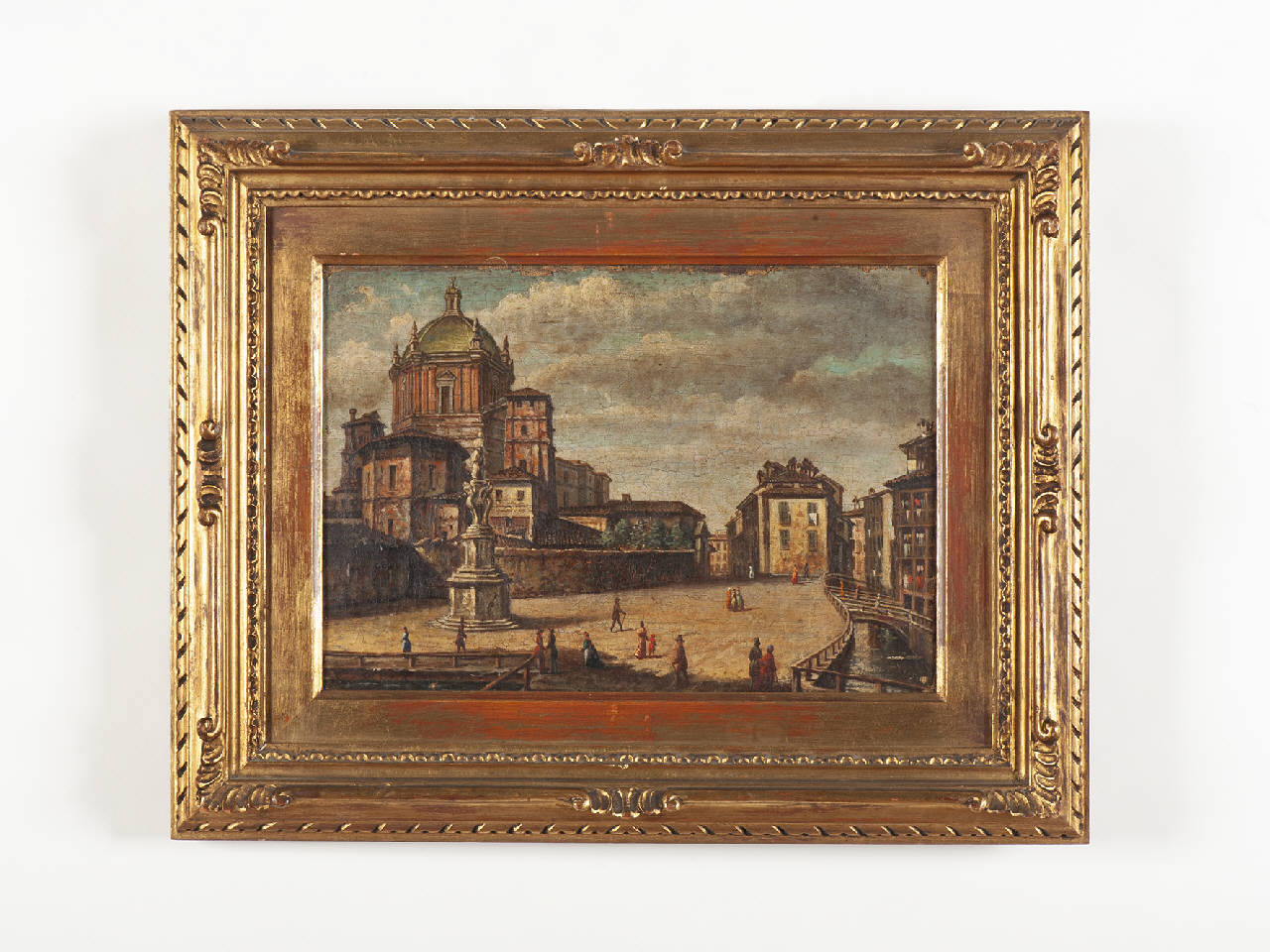 Dipinto inserito in una cornice in legno intagliato e dorato.\nContrasti chiaroscurali che mettono in evidenza le diverse architetture e il corso d'acqua. Si rivela un tono accademico nella resa del soggetto raffigurato.
