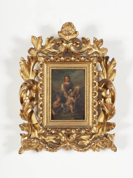 Dipinto inserito in una ricca cornice in legno intagliato e dorato con motivi decorativi floreali e vegetali.