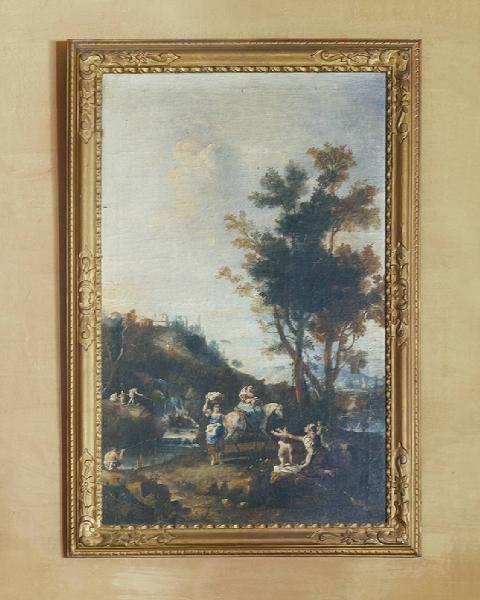 - NOTIZIE STORICO CRITICHE Il dipinto richiama i tipici paesaggi "a boscherecce", idealizzati e di sapore arcadico.Trattandosi molto probabilmente di un rifacimento in stile, l'atmosfera bucolica fresca e luminosa tipica settecentesca, è quì resa in modo meno sciolto, più schematica e rigida.